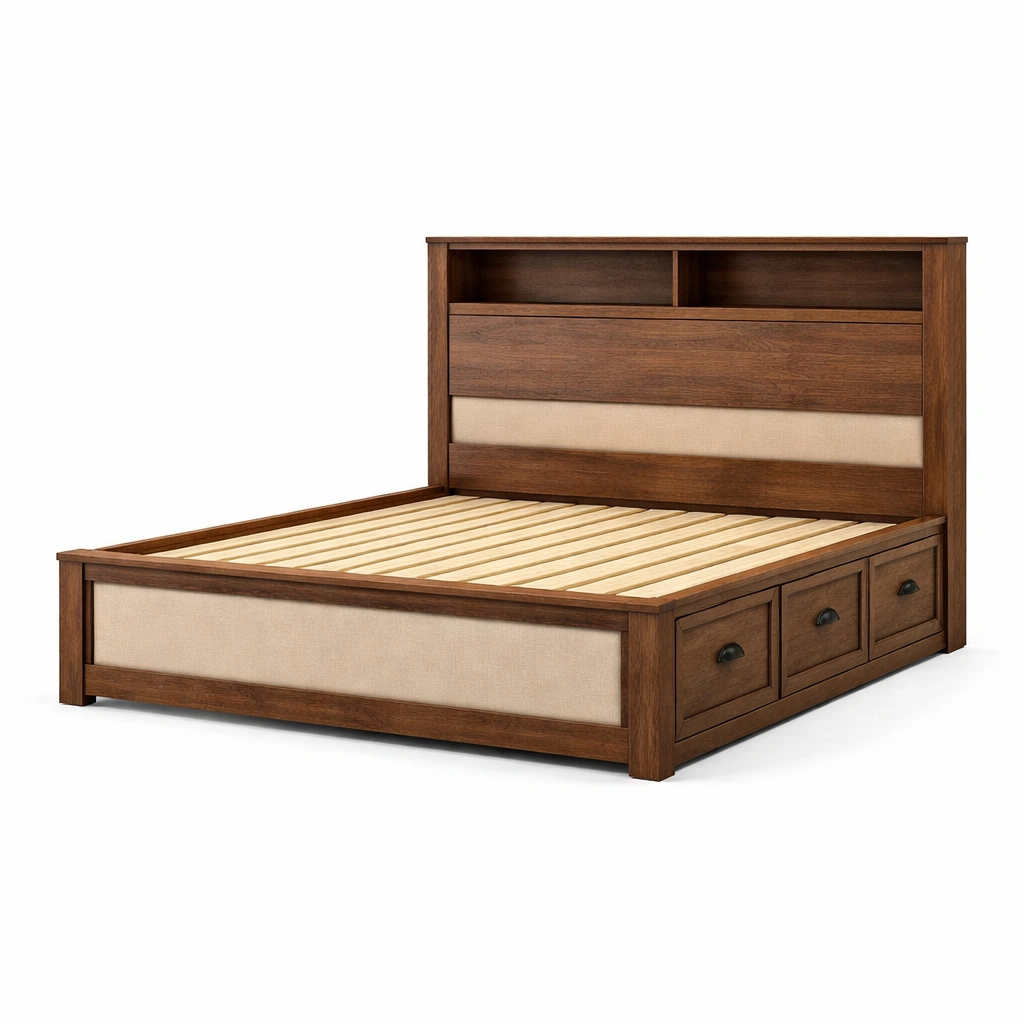 Cama con almacenamiento de madera de roble con cabecero acolchado y cajones