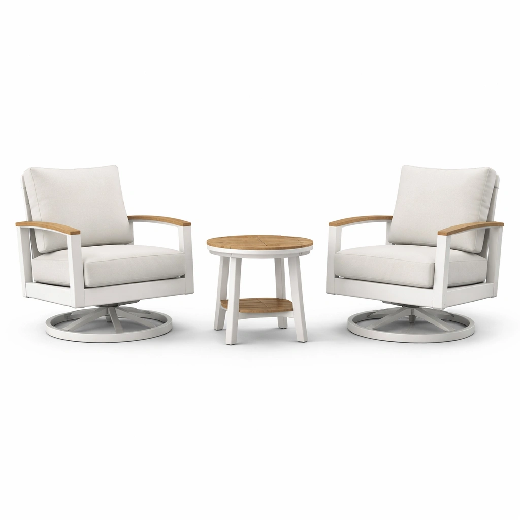 Conjunto de descanso de aluminio y madera con sillas giratorias y mesa
