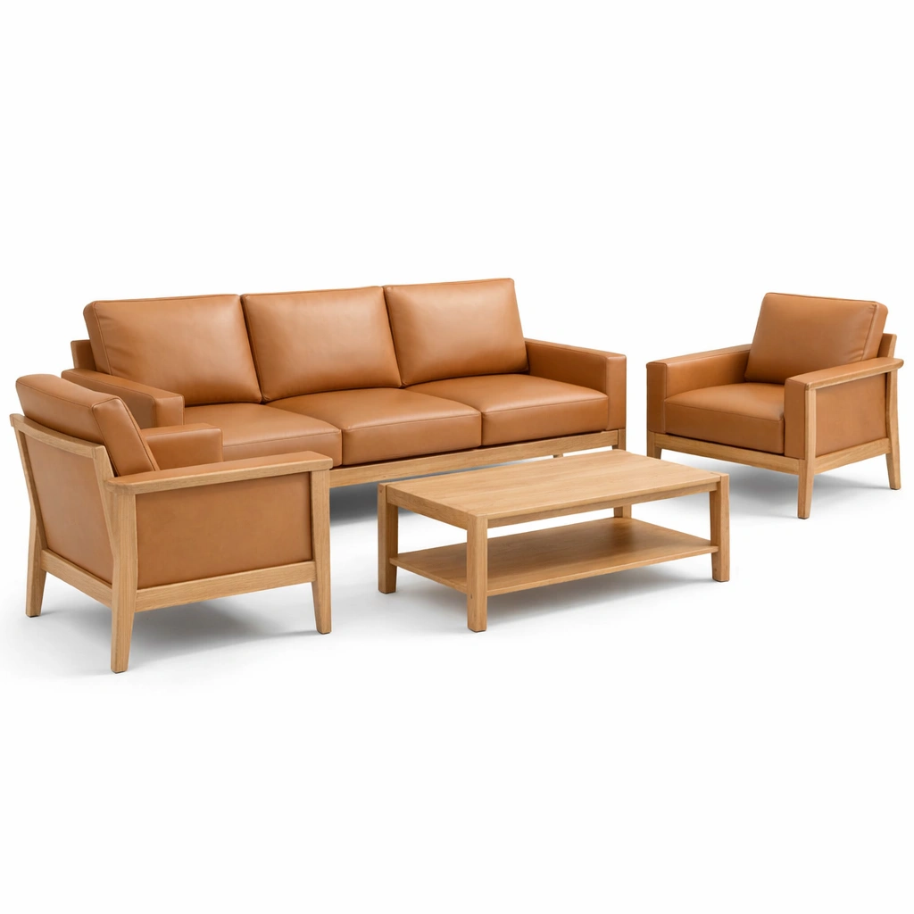El armazón está hecho de madera de roble maciza, y los asientos están tapizados en cuero sintético de poliuretano.