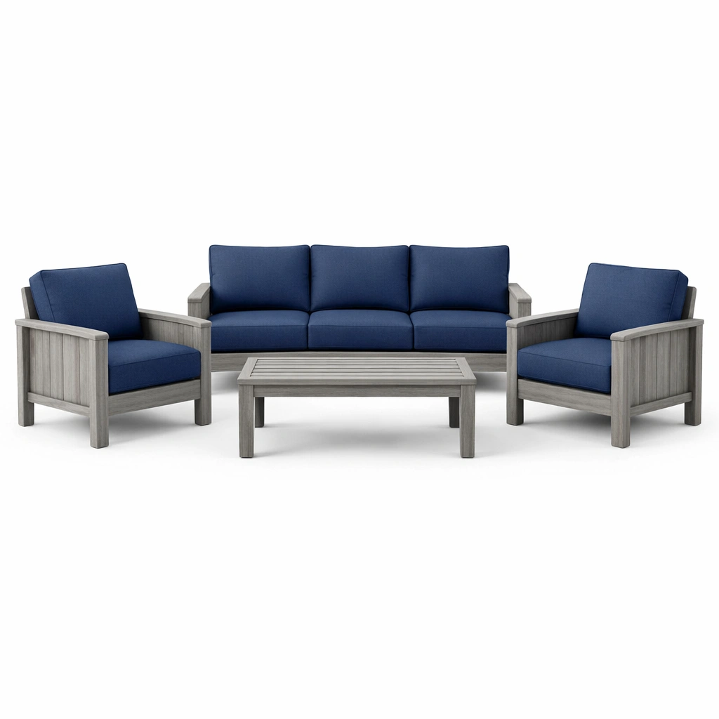 Conjunto de muebles para jardín compuesto por un sofá de 3 plazas, dos sillones individuales y una mesa de centro. La estructura es de madera resistente a la intemperie. Los cojines están hechos de tela de poliéster con relleno de espuma y son extraíbles con cremallera para facilitar la limpieza.
