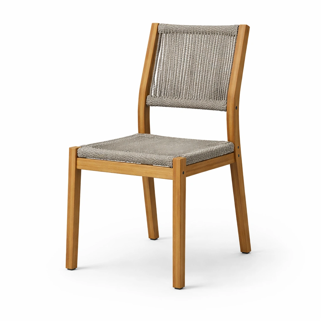Silla con estructura de madera maciza y asiento y respaldo de cuerda de poliéster tejido. La silla tiene una altura de 80 cm, un ancho de 50 cm y una profundidad de 55 cm. El peso total es de 5.50 kg. Color: Beige y Madera Natural. Capacidad de carga: 120 kg.