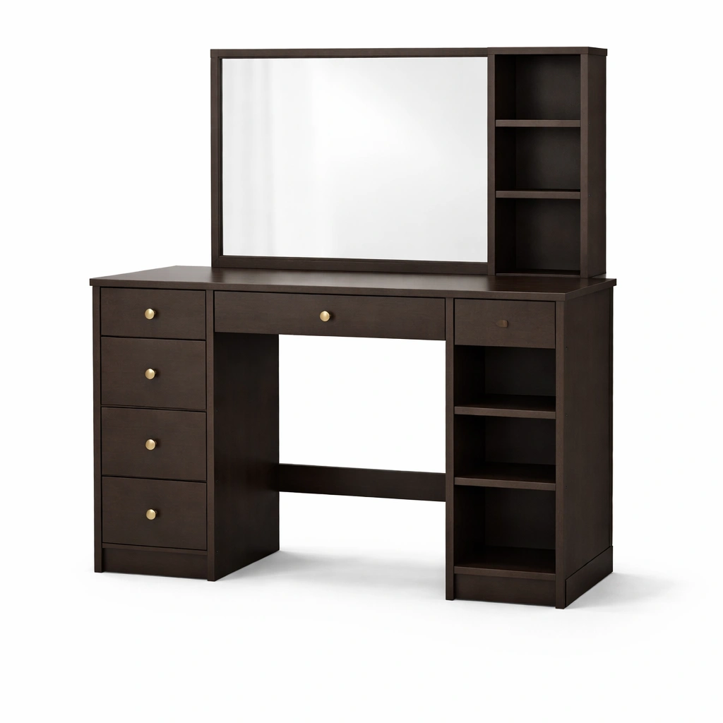 Este tocador está diseñado con cinco cajones para organizar accesorios y productos de belleza. Fabricado en MDF y madera maciza con un acabado en marrón oscuro.
